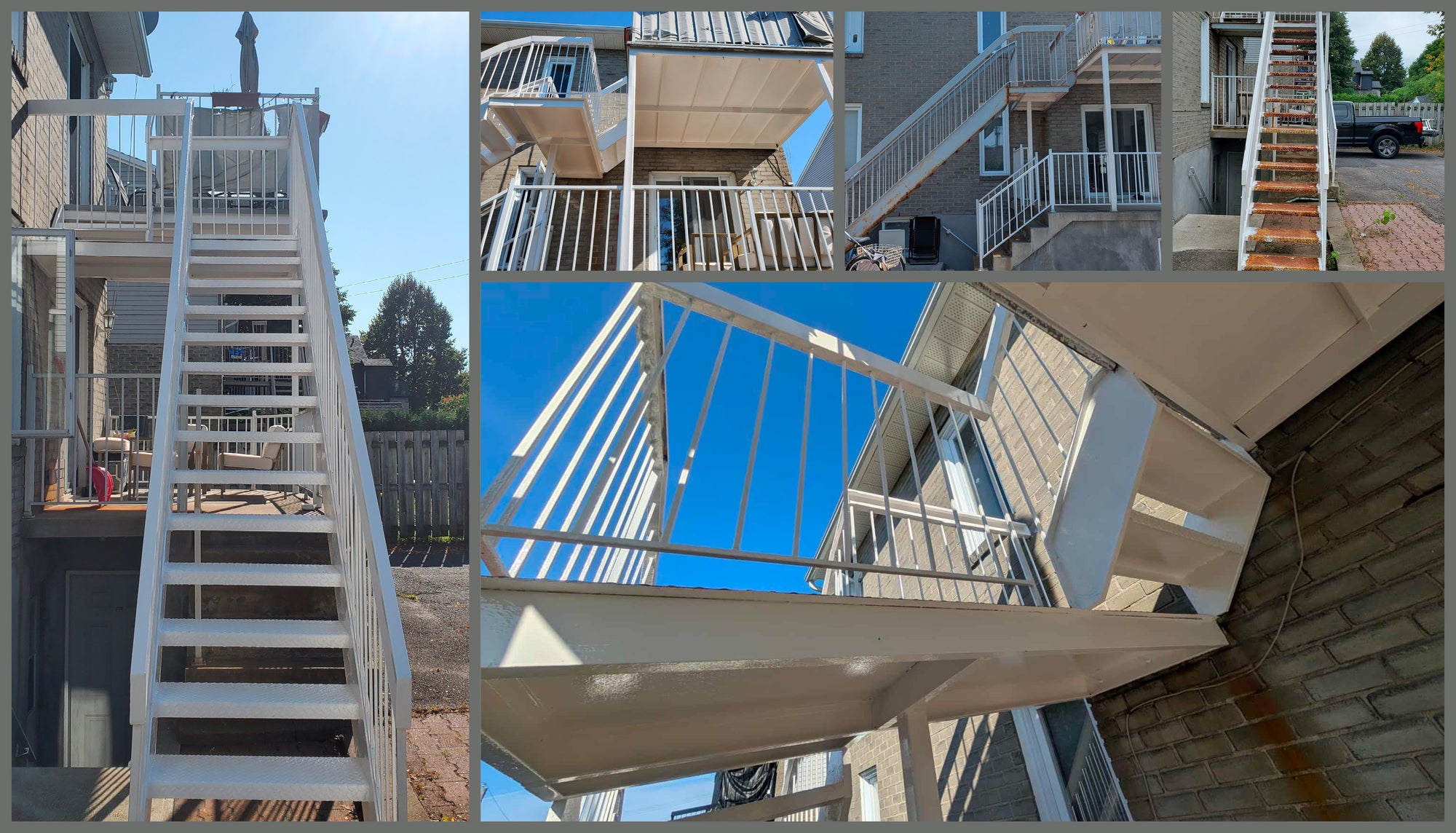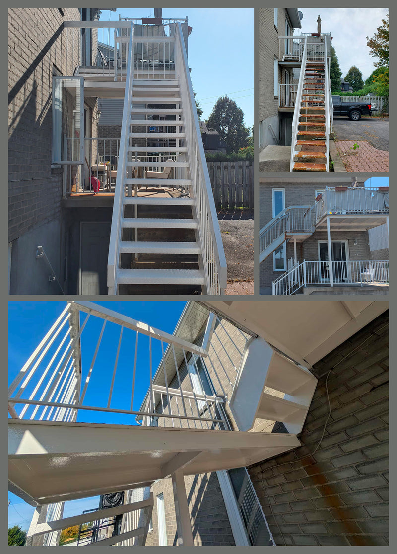 Remise à neuf d’un escalier extérieur : retrait de la rouille et application d’un nouveau revêtement.