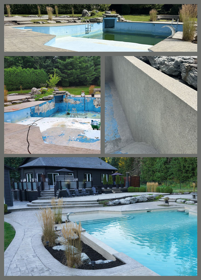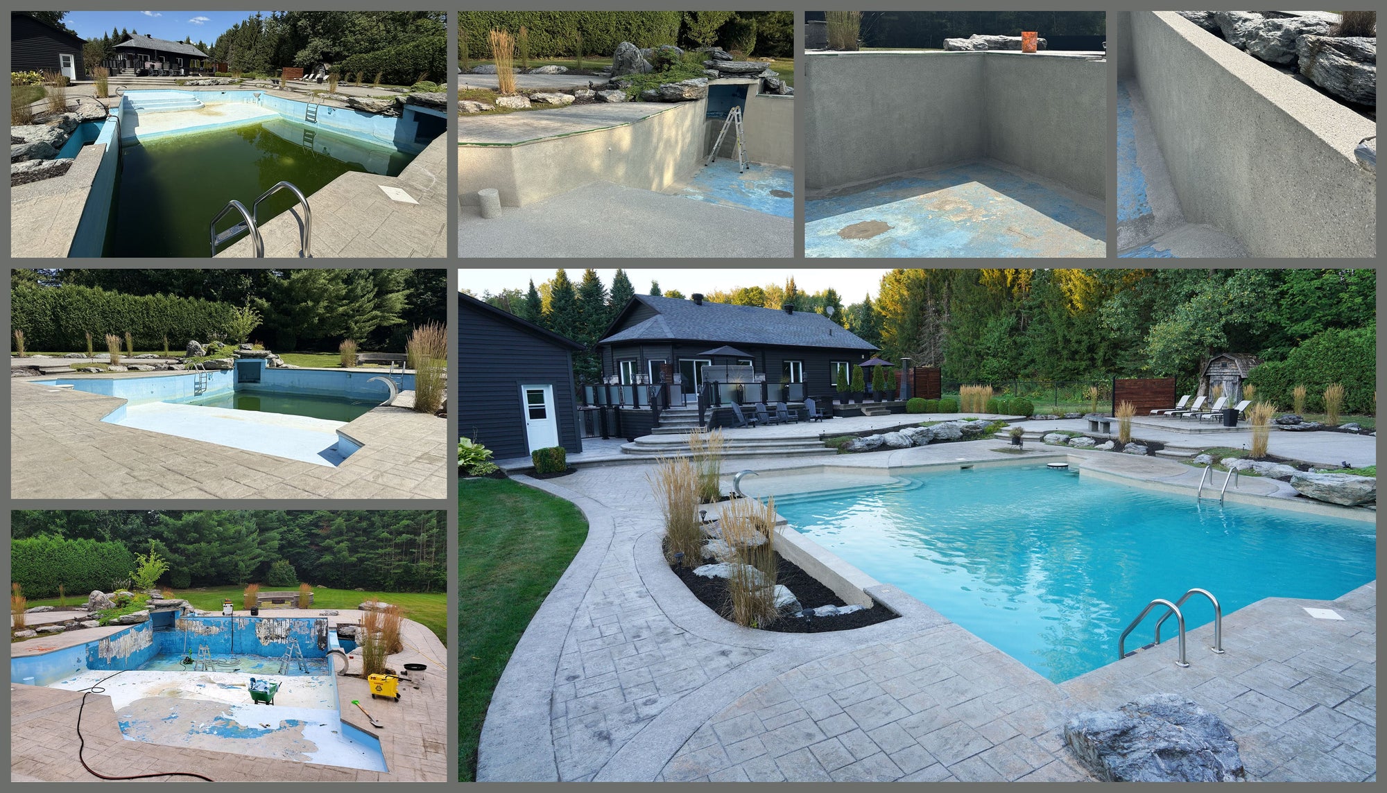 Transformation complète d’une piscine vieillissante : décapage, réparation et application d’un nouveau revêtement durable. Résultat : un espace moderne, fonctionnel et esthétique.